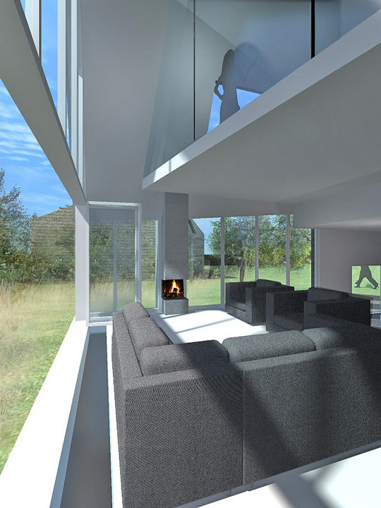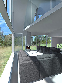De indeling van de woonkamer en de aangrenzende open keuken is gericht op optimaal comfort en welzijn. Er is niveauverschil tussen beide waardoor een speelse ruimtebeleving ontstaat. De woonkamer beschikt over een panoramisch uitzicht door de volledig glazen pui, die doorloopt tot de nok waardoor er een interessante vide geschapen is. Deze pui is bovendien voor geheel open te vouwen zodat binnen buiten wordt. De woonkamer beschikt tevens over een stijlvolle open haard.Keuken